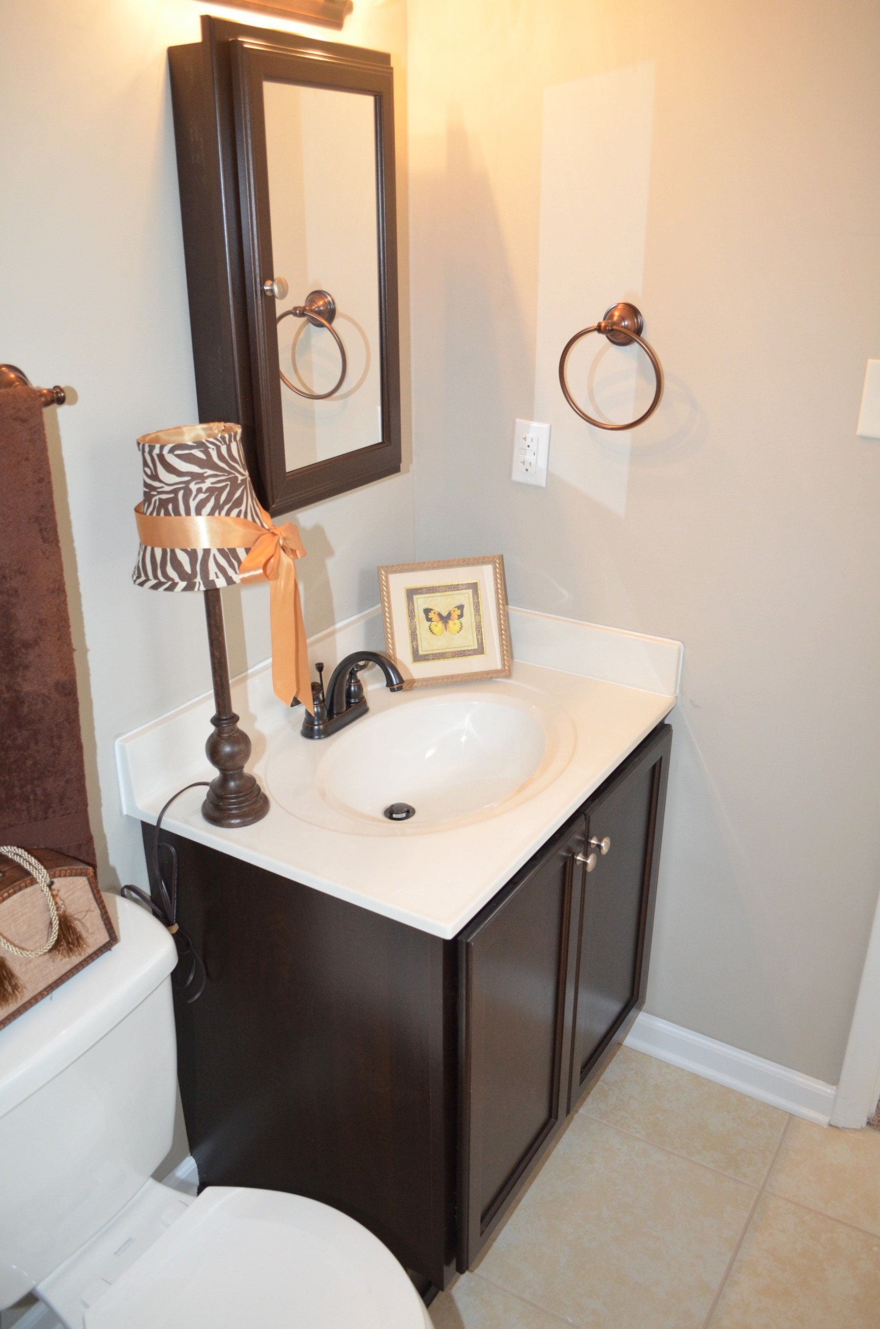 With all new cabinets, lighting, and tile, the remodeled bathroom is inviting and comfortable. All you need is your robe and to draw a hot bubble bath for this transformation to be complete.